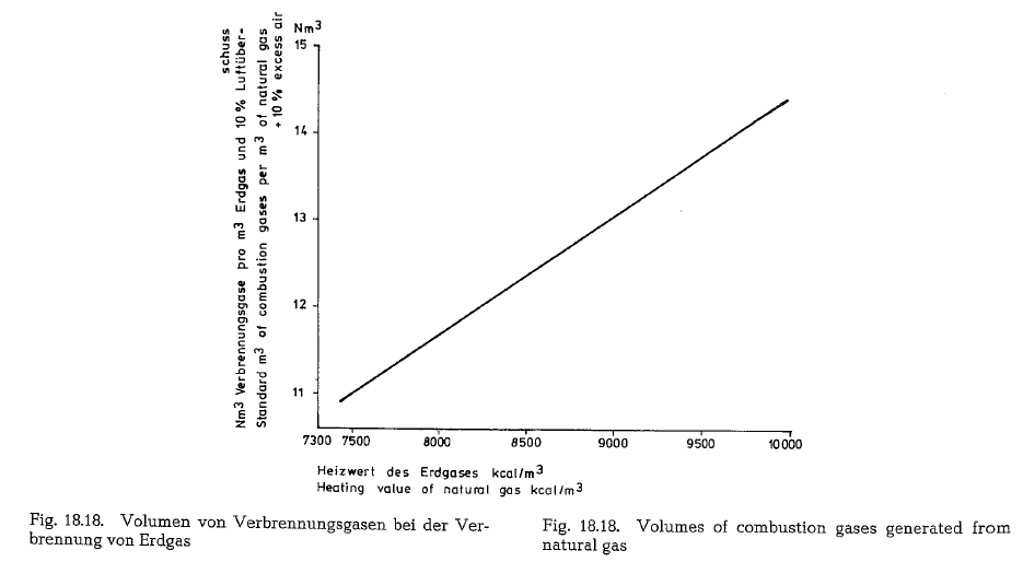 Fig. 18.18. contains a diagram showing the volumes of the combustion products in Nm3 (standard m3) at the combustion of 1 m3 of natural gas with different heat ing values, applying 10% excess air.