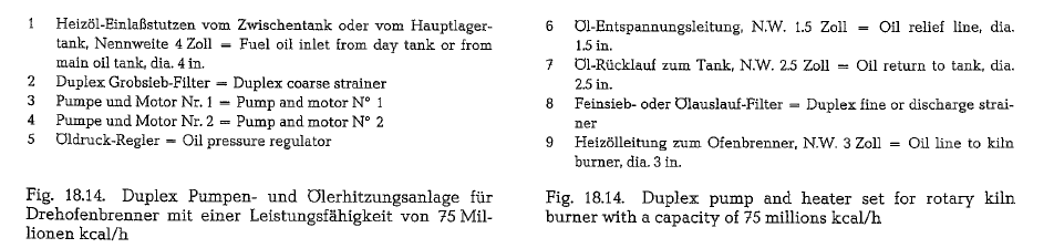 The pump and heater set heats the fuel oil from 50 oc to about 100 o -110 °C, and conveys it with the pres sure required for atomization into the kiln burner pipe. Fig. 18.14. shows a diagram of a fuel oil pump and heater set; this set works for a rotary kiln heat capacity of about 75 millions kcal/h with a through put of 128 kg/min of fuel oil, at a pump pressure of 21 atii. The entering temperature of the oil is 45 oe, and the temperature of the heated oil is approxi mately 110-112 oc.