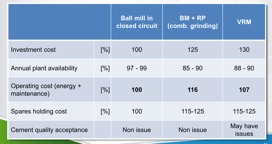 1. Of the 4 main mill systems in use for cement grinding, ball mills are by far the predominant, despite a higher energy consumption compared with a stand-alone Vertical Roller Mill or Roller Press;