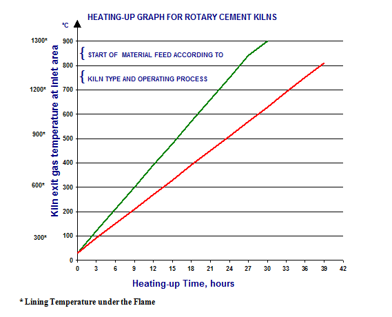 Most suppliers of refractory materials recommend for the start up of kilns after major turnarounds with monolithic linings, a maximum heating –up rate of approximately 25 °C /h in the sintering zone up to a temperature of 900 °C. After reaching 900 °C, heating up can continue at a rate of 50 °C up to the working temperature.