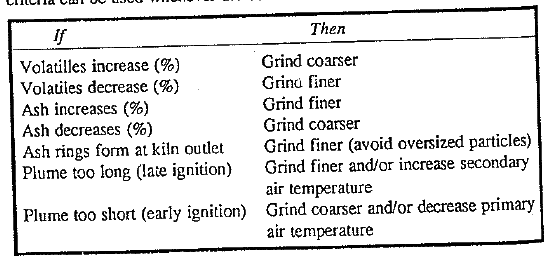 The optimum coal fineness must be established for each kiln and depends on such factors as type of coal fired and type of flame required. Sub· bituminous and high-volatile bituminous coal are usually ground coarser than low-volatile coal or coke. As a general guideline, the following criteria can be used whenever tl1e coal characteristics change: