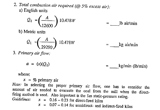 - Since one kilogram (or pound) coal requires approximately 5-10.5 kg (or !b) air for combustion, the fueVair mixture emanating from the coal mill must be kept well below this critical ratio to prevent premature ignition. Most coal mills operate at air/fuel ratios that are less than 2.0 kg (lb) per kg (lb) of coal. However, direct-fired kilns, with their high percent of primary-air requirements, usually operate at higher ratios and therefore need closer attention.