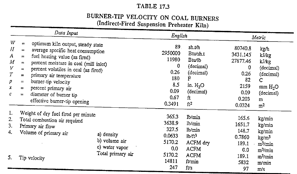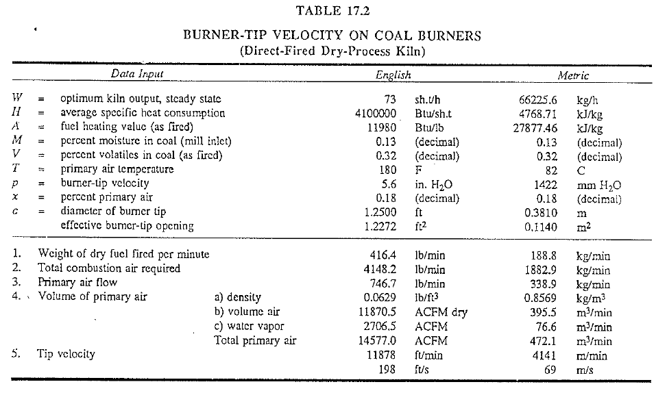 Using the above mentioned in computing tip velocity, the characteristics of coal burners have been determined and are shown in Table 17.1 (direct fired, wet-process kiln), Table 17.2 (direct-fired, dry-process kiln), and Table 17.3 (indirect-fired, suspension preheater kiln).