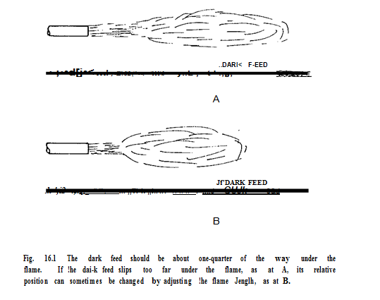 The dark feed should never be allowed to move further under the flame than one-half of toe flame length. When it becomes necessary to counter act the condition in which the feed has “slipped” too far under the flame, the operator can, if the means to do so are available, change the flame length to restore the dark feed position to the proper relation with the flame again. Fig. 16.1 shows how this is accomplished. Figure A depicts a condition in which the dark feed has advanced too far under the flame. By increasing the primary air pressure and temperature, and if possible the secondary air temperature, the flame will be shortened as shown in Figure Note that the position of the dark feed has not changed, but the relation between feed and flame is in its proper perspective again because the flame is shorter. This shortening of the flame results in more heat being released in the critical area where it is most needed.