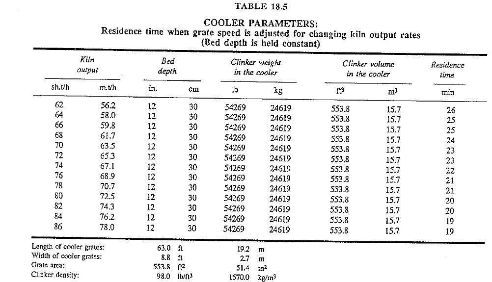 Residence Time at Cosntant Output. Under these circumstances, the bed depth is directly proportional to the grate speed. Knowing the area of the cooler, the bed depth under normal operating conditions for a given kiln output rate, and the density of the clinker, the residence time can then be calculated by Eq. (18·1).