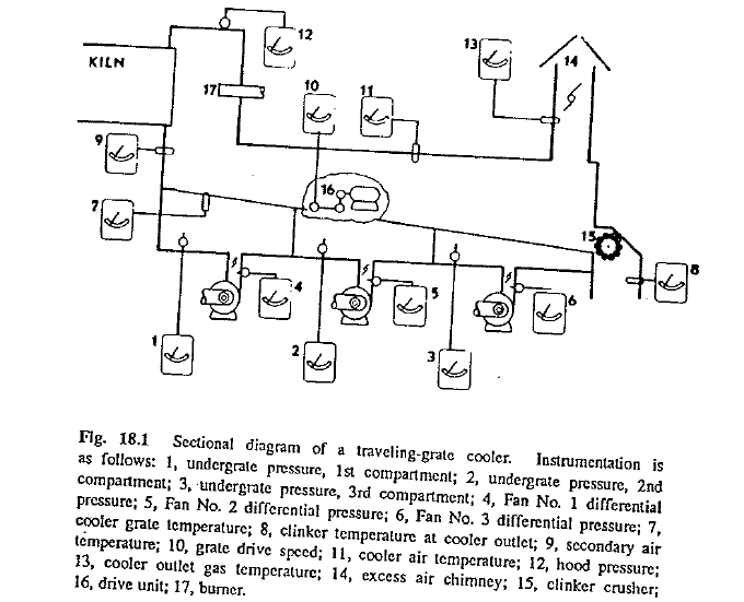 With the introduction of large-sized rotary kilns having production capacities in excess of 1500 tons per day, traveling grate cooler.; have become a problem in some plants. Unexpectedly, widespread complaints began as cooler components burned up and entire coolers had to be repaired at alarming rates. These problems were not only experienced in North America but were also encountered throughout the world wherever large rotary kilns had been placed into service. Regrettably, a final solution to the problem has not yet been found, and in some cement plants frequent cooler failures due to overheating still persist. On the other hand, major modifications and improvements in the design of cooler equipment in the past few years have lessened the problems to a large extent and indications are that coolers can now be made 19 operate in a satisfactory manner. Also, not all cooler failures are caused by design of the cooler itself, for inexperience and laxness on the part of operators has contributed to the problem. The detailed description of cooler control functions in this chapter can give the operator the information he needs to help lessen the frequency of cooler failures.