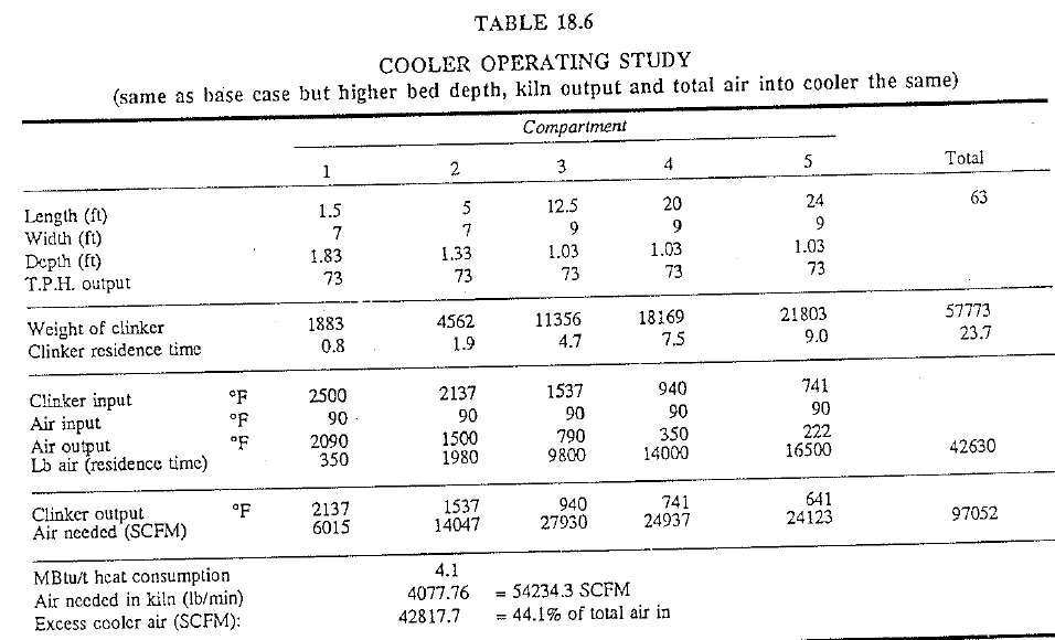 Naturally, this increase in bed depth (undergrate pressure) immediately im poses a higher restriction on the cooler air fans and demands sufficient fan capacity to overcome this added restriction. Consider the base case (Table 18.1). Here, 42,630 lb of air are given to the cooler in 20.9 min to cool 50,893 lb of clinker. Assume that this cooler would be operated with a higher bed depth but with the same kiln output and 42,630 lb air input. This operating condition is shown in Table 18.6 and indicates that the clinker residence time has increased from 20.9 to 23.7 min. due to the increase in residence time, the 42,630 lb of air now represents a specific air flow rate of only 97,052 SCFM. The most important aspect of this change is that the resultant increase of the clinker-discharge temperature from 224 F to 641 F is completely unacceptable and dangerous. Here too, the solution is to increase the specific air-flow rate (SCFM) to compensate for the increase in bed depth.