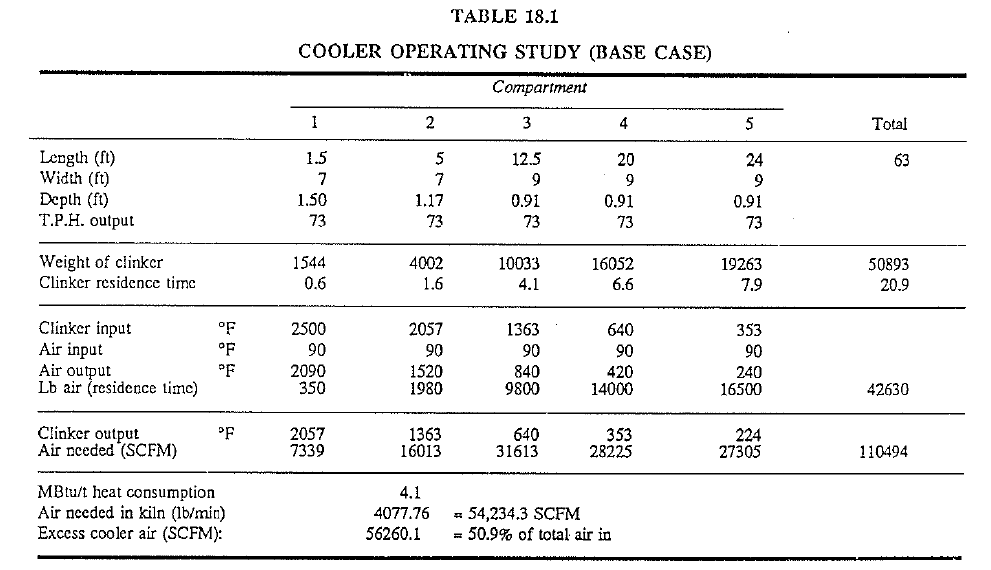 In Chapter 12 it was brieOy mentioned how important.it is to apply the maximum air in these compartments where it can do tl1e most thermal. work. This means, tl1e majority of the cooling work should be accom plished in the first and second compartments because it is here that the most efficient heat transfer will take place due to the large temperature difference between the air and the clinker. Once again, the base case in Table 18.1 is considered and it is assumed that 2000 lb more air is added into the fourth cooler compartment, i.e.; at the .place in the cooler where heat transfer is relatively ineflicient. Table 18.7 shows that this 4.7% increase in total air input results in a clinker-discharge-temperature drop of only 13 F (from 224 F to 211 F). It is assumed that all compartment air flows are readjusted to take advantage of the aforementioned thermo dynamic principle. In Table 18.8 air has been added to the second and third compartments while it has been reduced to the fourth and fifth compartments. The end result is that the total air input into the cooler has been reduced by 15% but the clinker-discharge temperature remains the same at 224 F. Once again, it is important for an operator to remember this principle of cooler-air application as this will lead to efficient cooler operation and possibly to less failures and damages to cooler components.