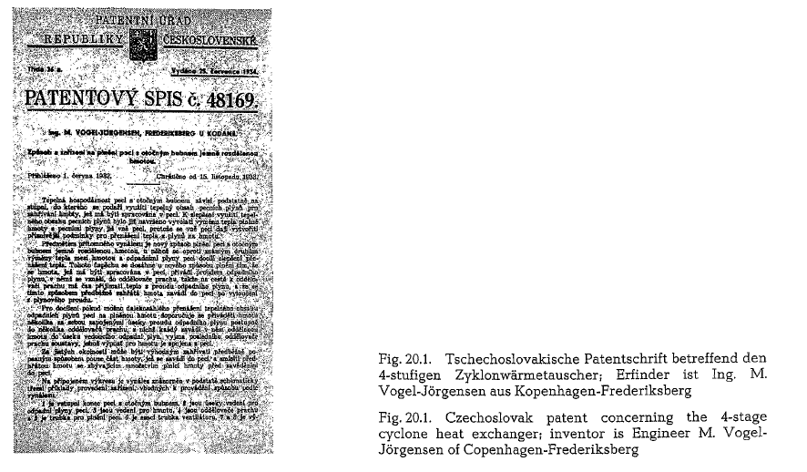 The first patent concerning the raw mix suspension preheater was applied for by Mr. M Vogel-Jorgensen, an engineer from Copenhagen-Frederiksberg; the application was submitted to the Patent Office of the Czechoslovak Republik in Prague, on June 1, 1932, under the name “Method and arrangement for feed ing a rotary kiln with fine dispersed material”‘. The invention was patented on July 25, 1934 (No 48,169).Vogel-Jorgensen was an employee of the F. L.Smidth Co., Copenhagen.