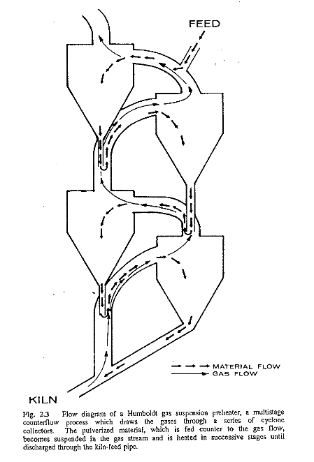 Fig. 2.3 Flow diagram of a Humboldt gas suspension preheater, a multistage counterflow  process  which  draws  the  gases  through  a  series  of   cyclone collectors. The pulverized material, which is fed counter  to  the  gas  flow, becomes suspended in the gas stream and is heated in successive stages until discharged through the kiln-feed pipe.