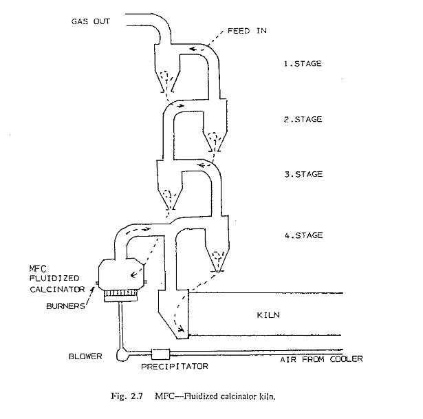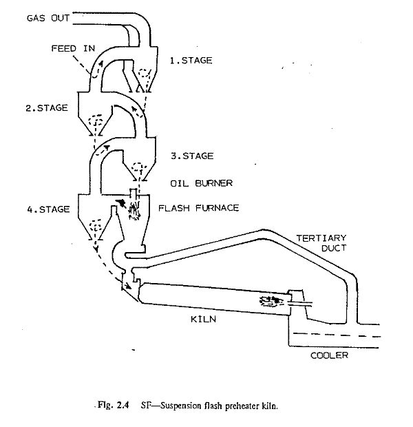 In the gas-suspension preheater kiln, the dry feed is preheated and partly calcined by the hot kilh exit gases in a tower of heat exchange cyclones. This concept is, contrary to popular beliefs, not new because a patent on this type of kiln was issued in Czechoslovakia already in the early 1930’s. However, the suspension preheater kiln as it is known today did not come into its own right until after World War II when German kiln manufacturers were able to overcome the operational and structural problems of these types of kilns (Fig. 2.3).