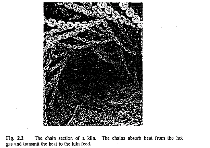 Fig. 2.2 shows a picture of a chain section.  The gases enter the chains at a temperature of approximately 800 C (1470 F) and leave tl1e kiln exit at a temperature of 450 C (840 F).  In countercurrent flow, the material  enters the chains with a temperature of 50 C (120 F) and emerges from the chain section with a temperature of 730 C (1350 F). Chain sections are a high maintenance item; difficult to repair but an absolute necessity for efficient operation. Because of the high costs of these chains, there is a tendency in many plants to neglect proper and frequent maintenance. How­ ever, i_t has been found in many instances that the costs saved, by not tak­ ing care of the chain system, are coming back manyfold in the form of higher fuel operating costs.