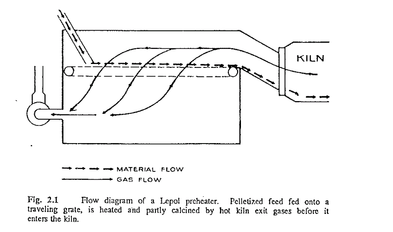 In the grate process, pulverized dry-kiln feed is first pelletized into small nodules by means of 10-15% water addition, then the nodules are fed onto a traveling grate where they are partly calcined before they enter the rotary kiln. Heating of the nodules is effected by the exit gases from the rotary kiln, the hot gases passing through the material bed from above as they are drawn downward through the grates by means of a fan. The partly calcined material then falls down a chute into the rotary kiln where final clinkeriza­tion takes place. Because the kiln feed is already partly calcined before it enters the kiln, the rotary kiln itself is only about one-third the usual length. Fig. 2.1 is a schematic diagram of the flow of gas and material through a Lepol grate-process preheater.