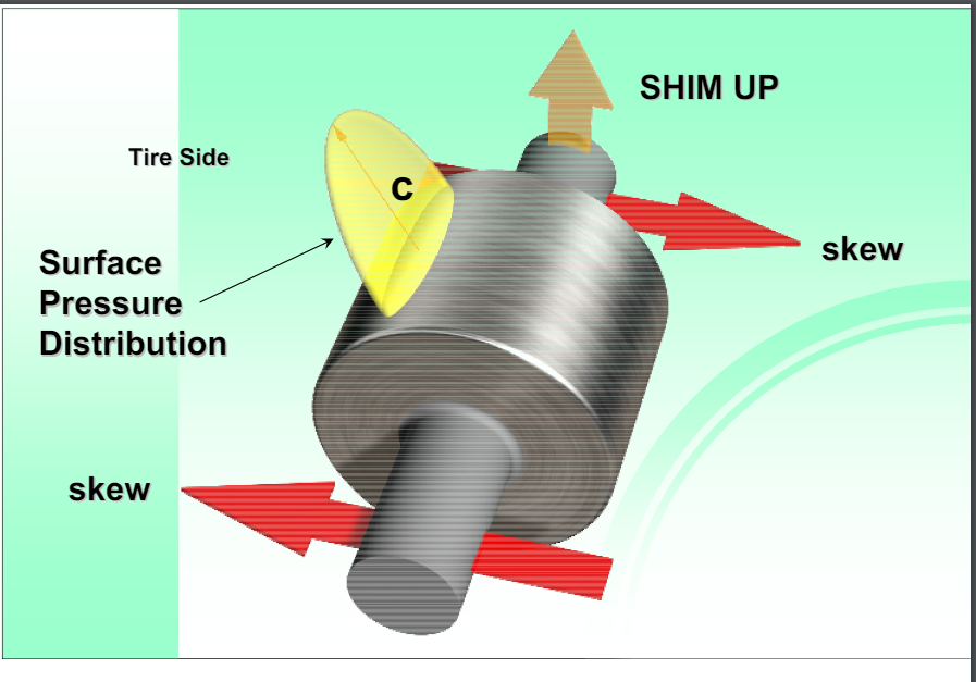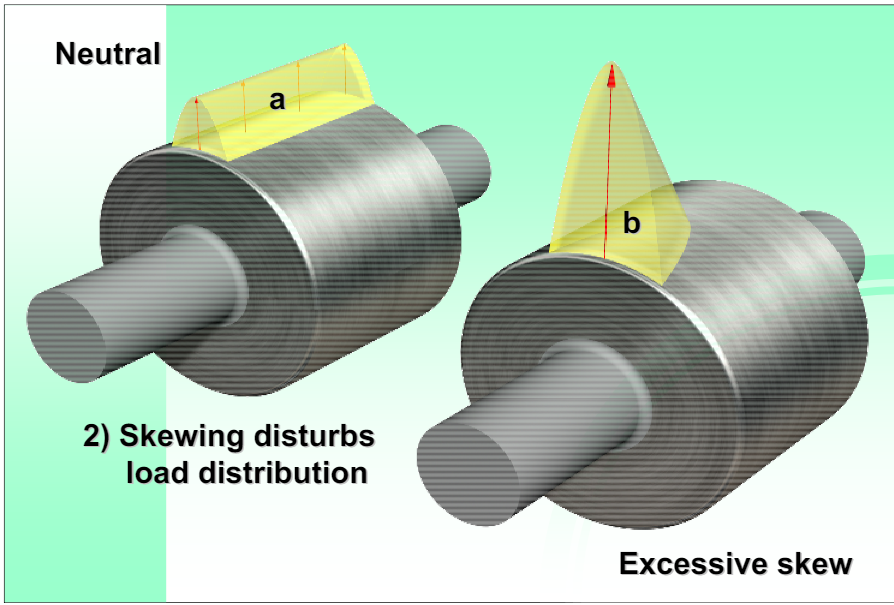 It is most desirable to have the area of contact as rectangular as possible. When skewing is required, which is the case for many units by design, then clearly the minimum amount of skew to just balance the down thrust of the shell, should be sought. The skewing should be shared equally by all the rollers. For illustration purposes diagram shows excessive skewing, so much so that only half the roller face is in contact. Since the load this roller carries has not changed, the stresses in this reduced area must necessarily be higher. Visually the stress volume of the yellow shape must equal that of the other side. We can see therefore that excessive skewing decreases the contact area and increases the unit load, and stress, in that area. The contact area behaves similarly to a car tire in contact with the road. The contact area actually flattens out and the material in the flat area deforms. When this deformation exceeds the elastic limits of the material, it fails.