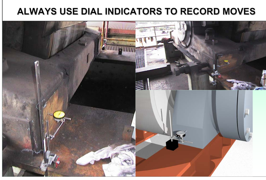 Moves can be properly measured using dial indicators, one for each bearing assembly. Often the magnetic bases for the dial indicators are inadequate to hold the indicator reliably over the course of an adjustment campaign. Weld brackets to the base and use clamps to hold the indicators for 100% reliability.