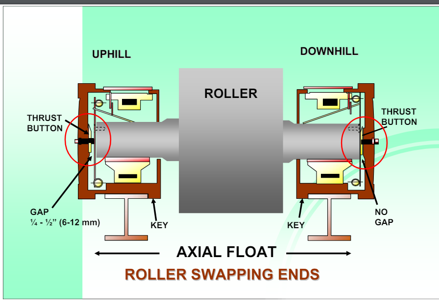 Both uphill and downhill bearing housings are keyed into the bases such that the space between the thrust buttons is ¼ – ½” or 6 – 12 mm larger than the length of the shaft. This allows the roller to have that much axial float. When the roller is skewed to drive the shell slightly uphill, its reaction is to slide downhill. The normal and expected position for all the rollers is to be in contact with the downhill thrust button.