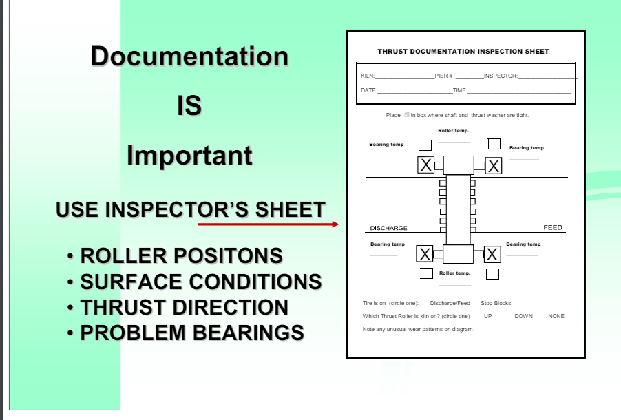 Documentation is important. Only one person should be given authority to have moves made. He should provide written instructions as to which bearing should be moved and in what direction. Personnel making the moves should record, date and sign a record of their work. Inspection sheets, as shown here for example, are an efficient way to do this. These sheets should then be kept in a logbook. A running history of roller adjustments is necessary to maintain control of the mechanical condition of the kiln. If multiple moves on one roller are anticipated, this sheet needs to be accompanied by a table on which moves, times and temperatures can be listed.