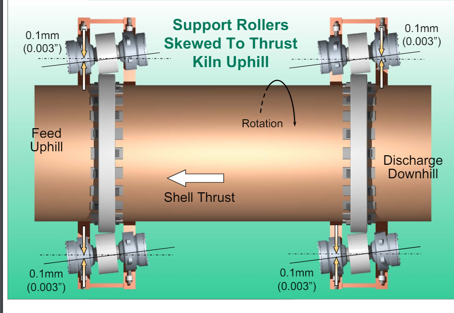 Unfortunately, many designs require that support rollers be skewed. The thrust mechanisms of these designs are inadequate to support the entire downward thrust of the shell. This is especially true of large long rotary kilns. Since most of this type of rotary trunnion-supported equipment is installed on a slope, there is a natural component of force acting in the axial direction of the shell. If this force cannot be completely managed by the thrust mechanism(s) it is the skewing of the support rollers that must help out. Skewing is a compromise. Skewing accelerates the wear and tear of the support mechanisms but then allows smaller, less costly thrust mechanisms to operate successfully. If skewing is insufficient the thrust mechanisms will fail prematurely. If skewing is excessive additional wear and tear of the support components takes place and the thrust mechanism can still fail. If rollers are skewed against each other, wear and tear takes place but the advantage supposedly gained by skewing is lost. The maximum performance life of rotary equipment that requires skewing, can only be achieved by skewing correctly and keeping it to a minimum. The amount of skew shown in the illustration may be sufficient for most installations.