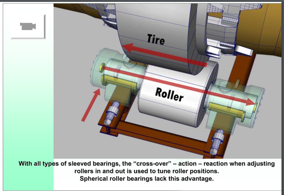 If rollers are out of parallel with one another and with respect to the drum’s axis of rotation, it is not desirable. Toed-in rollers can balance each other, one pushing the tire down as hard as the other is pushing it up. If this situation exists the shell may be “floating”. Floating means that the shell is balanced between thrust rollers. But it is not the desired situation. Left uncorrected there is unnecessary wear and tear on the whole support. Left for long periods of time the tires and rollers will wear into a cone shape.