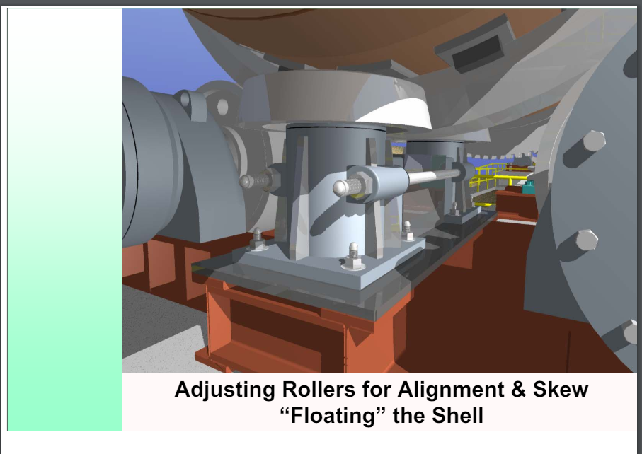Skew is the position of the roller axis with respect to the turning axis of the shell. If they are parallel then the roller is said to have zero skew or be neutral. Zero skew means no axial thrust is created. If the roller is not parallel then it is said to be skewed or “cut” and does create an axial thrust that pushes the kiln either uphill or downhill. Because kiln shells are not truly straight its rotating axis at the rollers is not constant. Zero skew cannot be set with rollers that have a fixed base. This is only possible if the roller support base is allowed to articulate to follow the shell/tire wobble.