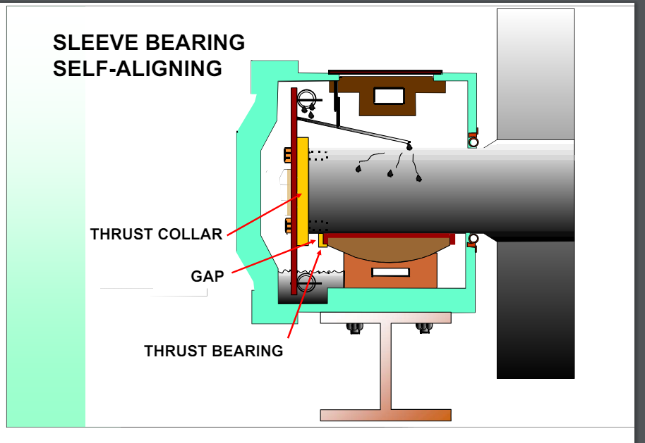 Sleeve Bearing, Self-Aligning with Thrust Collars on the Shaft. The thrust collars are located on the ends of the shaft or on the shoulder of the shaft near the roller. Visual inspection through the inspection ports of the housing allows us to locate the gap. This is the gap between the thrust collars and the thrust bearing. With the thrust arrangement as shown above, the normal expectation is to have the gap on the downhill end of the shaft. This indicates the roller is positioned downhill and is pushing the shell uphill.