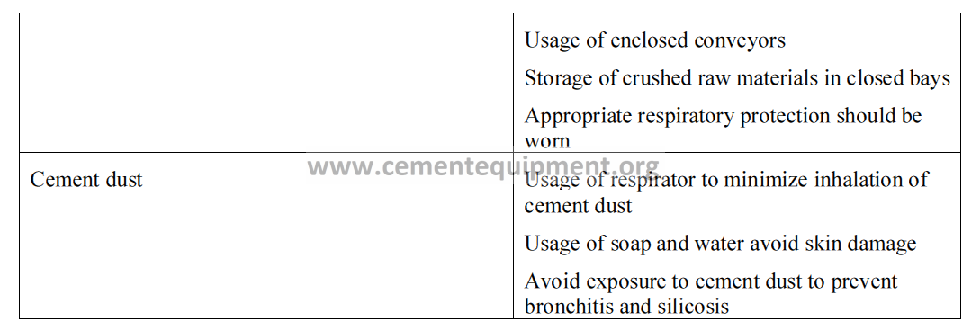 In Table 2, main hazard factors associated with cement manufacturing processes are presented. As shown from Table 2, main hazardous factors in quarrying of raw materials can be defined as dust and noise. Noise emits during balsting, crushing and operation of conveyors in quarrying operations. Noise sources in cement manufacturing plant mainly include milling machines, crushers, electric motors (Canfeng 2012).