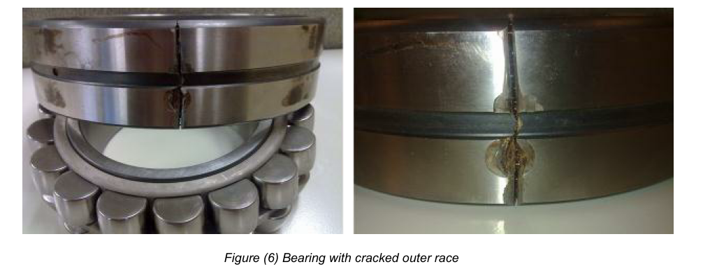 System results, presented in figure (4), displayed an alarm on the fan inboard bearing and alerted for inspection. The spectrum frequencies matched the Ball Pass Frequency Outer Race (BPFO) of the fan inboard bearing. Furthermore, comparison with the offline vibration system, displayed in figure (5), confirmed the findings. Visual inspection of the bearing, pictures displayed in figure (6), found a crack in the outer-race and prevented a catastrophic failure.