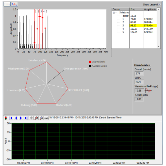Spectrum analysis showed harmonics of BPFO and automatically allocated that to the bearing condition axis on the radar view. Furthermore, the radar view pointed out that the bearing condition fault amplitude (displayed in black) exceeded the set alarm limits (displayed in red).