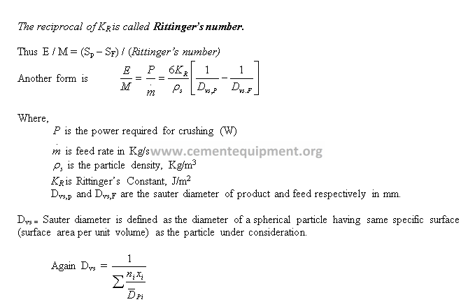 One of the laws of comminution or crushing has been proposed by Rittinger. According to Rittinger’s law, the work required for size reduction is directly proportional to the new surface created.