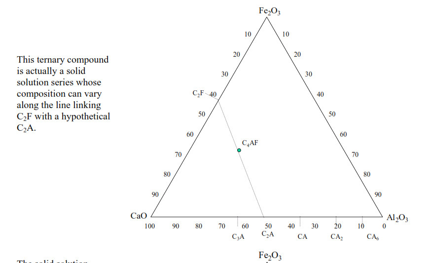 The part of the ternary system between CaO-Al2O3,-Fe2O3, CAF, of relevance to cement chemistry is as follows: