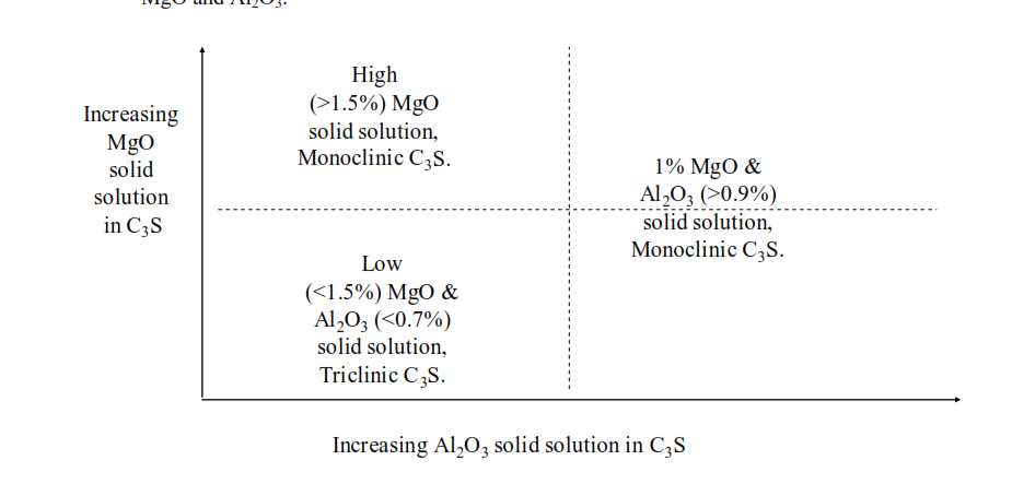 Arthur Harrisson’s work illustrates that it is the combined effects of solid solution of minor components that determines the polymorphic form of C3S. Lea reports that the stabilisation of triclinic or monoclinic C3S depends on the combined solid solution of MgO and Al2O3.