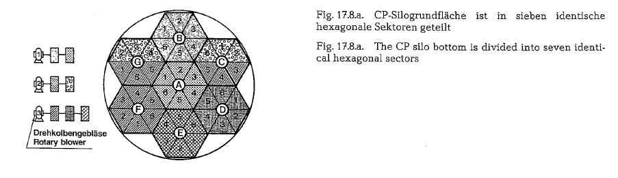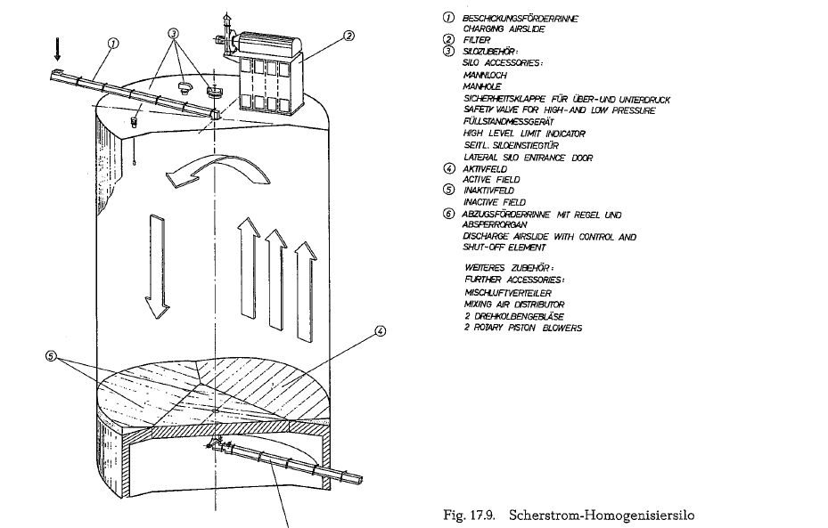 Fig. 17.7. shows a pneumatic homogenizing discontin­ uous mixing and a storage silo in piggyback construc­ tion. The upper homogenizing silo operates according to the SKET/ZAB mixing stripe system. The installed aeration pads from stripes across the silo floor; the stripes are alternately aerated, whereas the lower storage silo is equipped with a conically shaped silo floor around which aeration pads are placed in ring form. These rings are divided in eight sections.