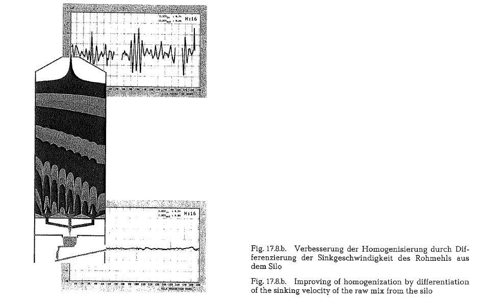 With the so-called discharge homogenizing system, when homogenizing and storage takes place in one silo, an equalization factor of 4 to 6 can be achieved, and the total specific power consumption varies between 0.4 and 0.6 kWh/t (metric).