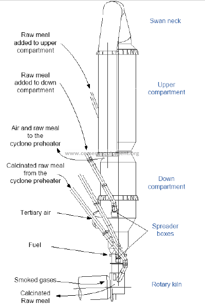 Preheated in the cyclone tower raw meal is transferred to the calciner, where calcium