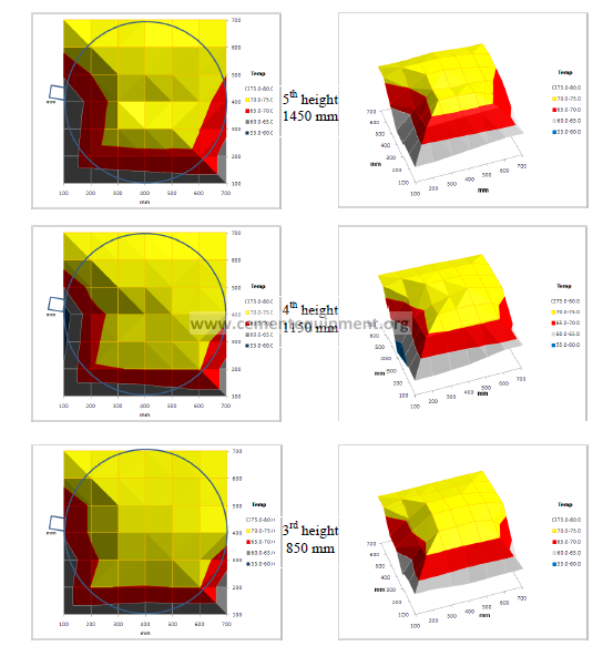 Figure 5.6 Temperature field for three heights of the calciner – from the top of upper part.