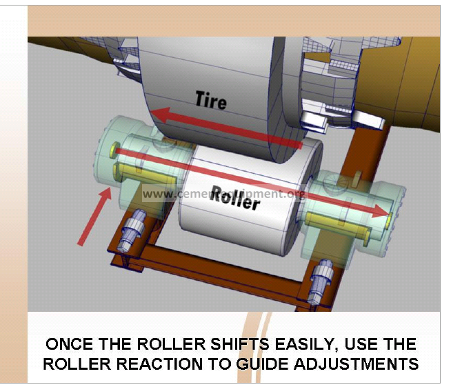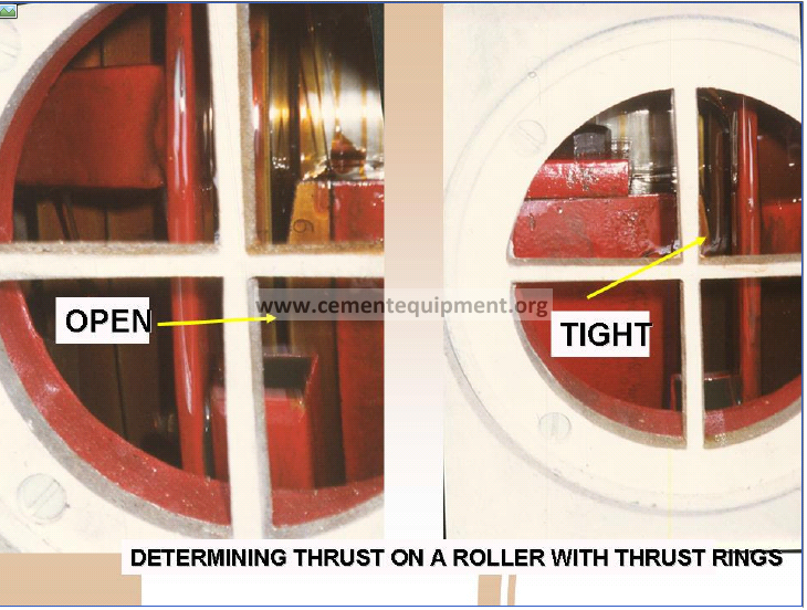 Toed-in rollers can balance each other, one pushing the tire down as hard as the other is pushing it up. If situation exists the shell may be “floating”. Floating means that the shell is balanced between thrust rollers. But it is not the desired situation. Left uncorrected there is unnecessary wear and tear on the whole support. Left for long periods of time the tires and rollers will wear into a cone shape.