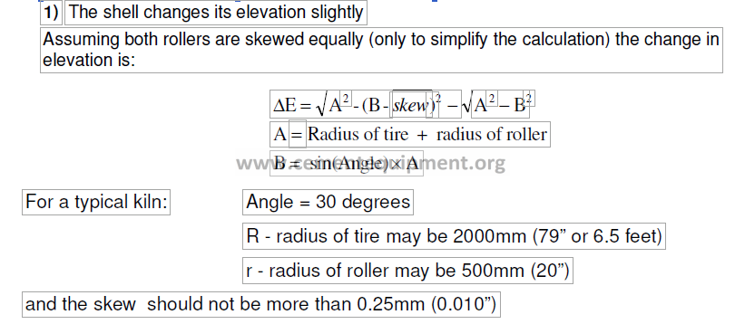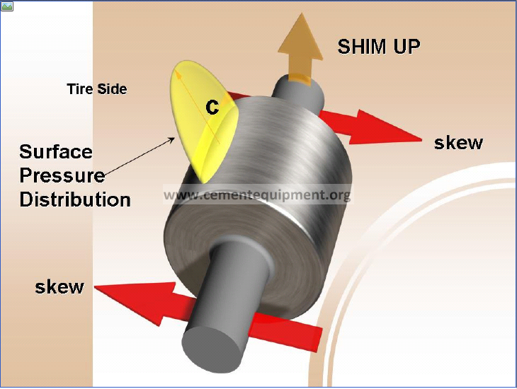 On the upturning side of the kiln shell the downhill bearing is shimmed and on the downturning side the uphill bearing is shimmed. The shim thickness is about 0.6 times the amount of skew.