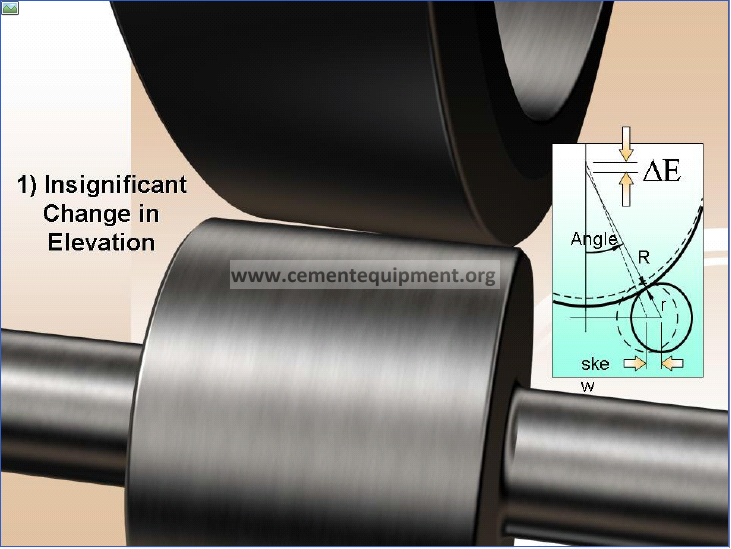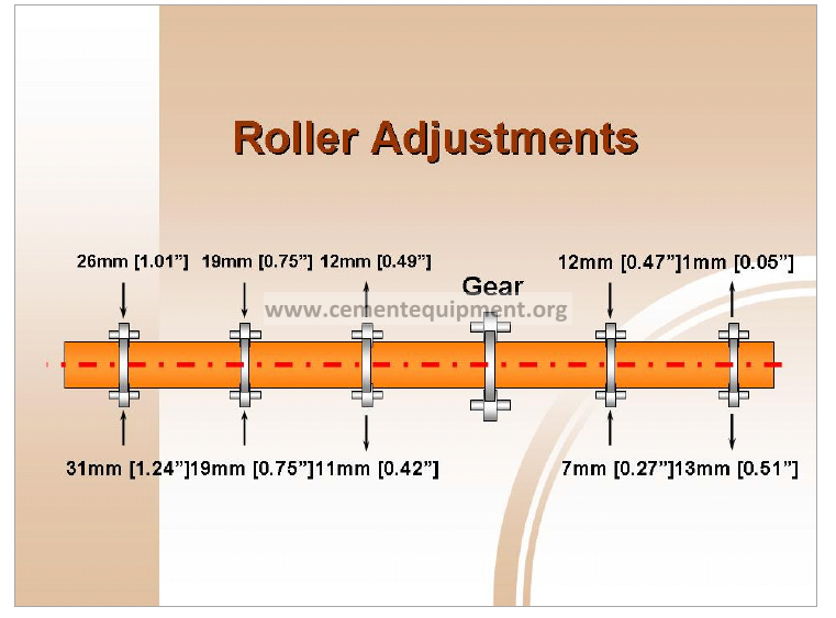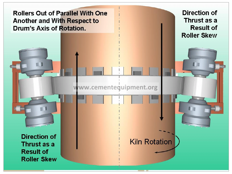 Skew is created with a very small (0.004 to 0.040 inches, 0.1 to 1.0 mm) pivoting adjustment and only changes the parallel relationship of the roller to the longitudinal axis of the rotating shell. It does not affect (to any significant degree) the position of the shell either in plan or elevation views. In other words the roller is pivoted but the shell is not significantly raised or moved laterally.