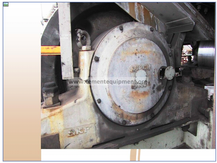 Both uphill and downhill bearing housings are keyed into the bases such that the space between the thrust buttons is ¼ – ½” or 6 – 12 mm larger than the length of the shaft. This allows the roller to have that much axial float. When the roller is skewed to drive the shell slightly uphill, its reaction is to slide downhill. The normal and expected position for all the rollers is to be in contact with the downhill thrust button.