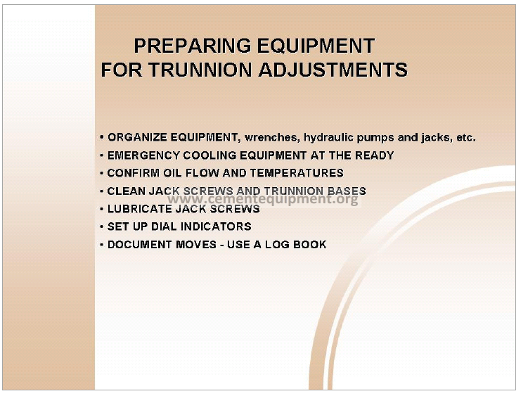 Once preparations are complete the first task is to record the temperatures on all bearing at all piers. An adjustment on one roller changes the overall thrust on the kiln and can cause it to shift with the potential of causing a hot bearing on another pier. Recording all bearing temperatures frequently throughout this process is required.