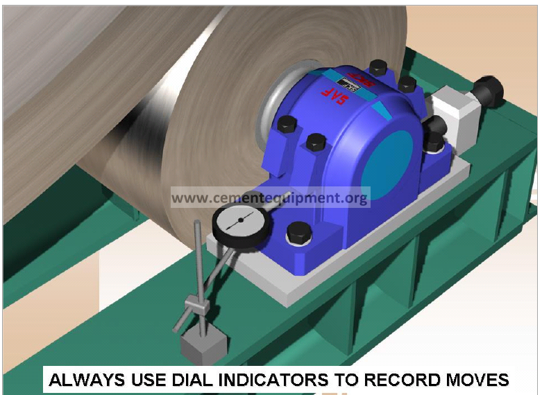 Moves can be properly measured using dial indicators, one for each bearing assembly. Often the magnetic bases for the dial indicators are inadequate to hold the indicator reliably over the course of an adjustment campaign. Weld brackets to the base and use clamps to hold the indicators for 100% reliability.