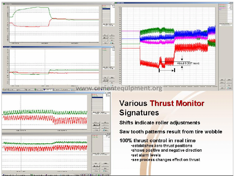 The illustration, upper right, shows the thrust monitor straight lines, indicating no rotation, coming in from the left. Since all the sensors were made active on one screen for easy comparison they were “zeroed” with an offset so that one did not hide the others. As soon as rotation commenced only the “blue” roller remained at zero thrust indicating it was neutrally skewed. Both the red and pink rollers dropped down from their “zero” position indicating they are skewed to push the drum downhill. This is obviously an unwanted situation. The green roller’s thrust went positive (higher than its zero set point) indicating it is the only one pushing the drum uphill.