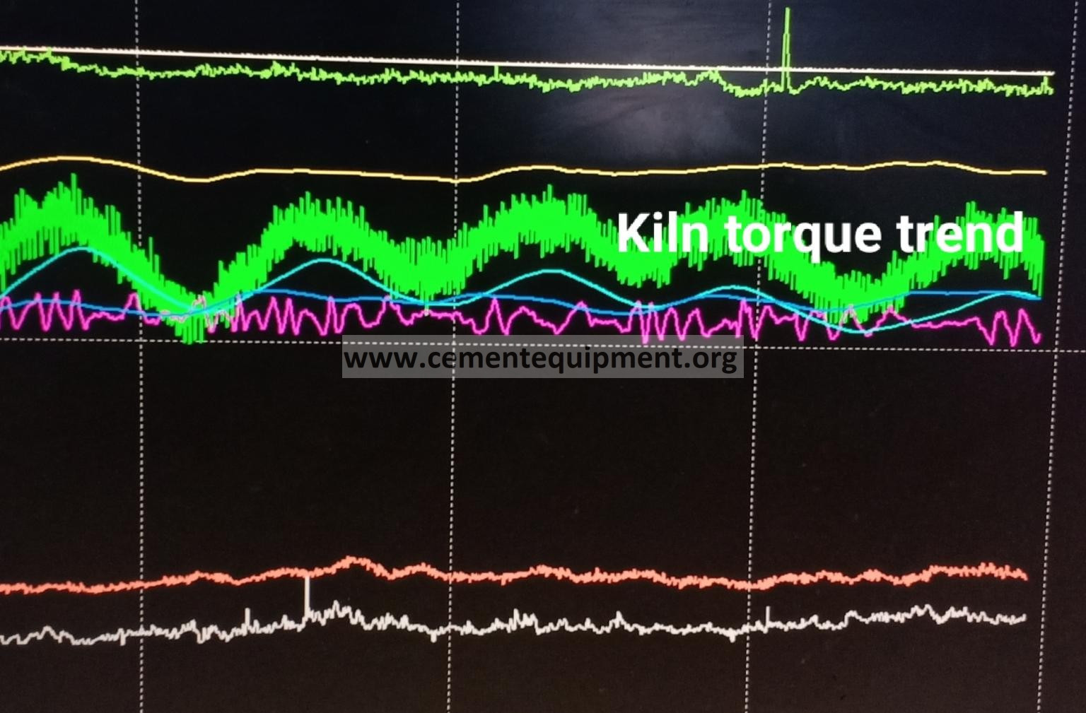 Note: the green trend is for the kiln torque and the light blue is for the temperature of materials of the lowest cyclone.