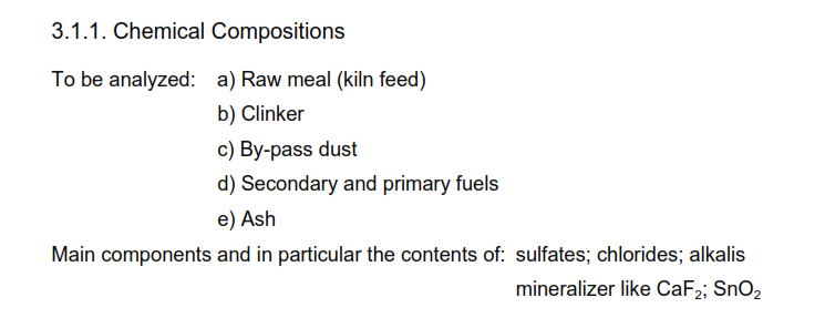 Essentially cement clinker consists of tricalcium silicate (Alite), dicalcium silicate (Belite), tricalcium aluminate (Aluminate) and calcium aluminoferrite (Aluminoferrite). It is produced from a raw material mix which contains mainly calcium oxide (CaO), silicon dioxide (SiO2), aluminium oxide (Al2O3) and iron oxide (Fe2O3). A summary of the potential phase composition are shown in Table 1.