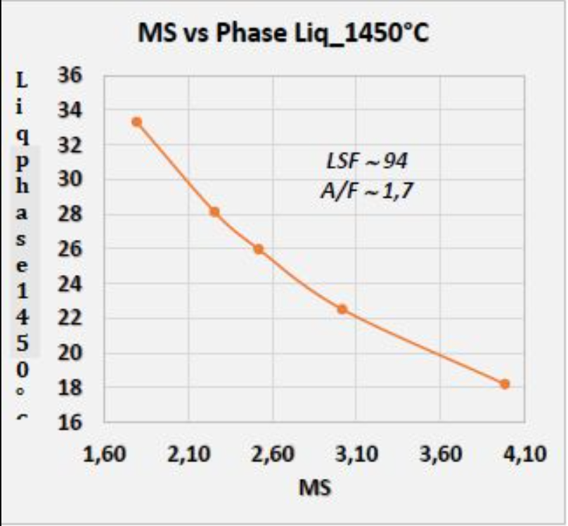 - Decreasing Liquid Phase Formation with Increasing MS: As the Modulus of Silica increases, the graph indicates a decrease in the ability to form a liquid phase at 1450°C. This suggests that higher silica content in the mix reduces the ease with which the liquid phase forms.
