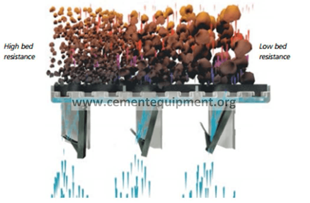 A fixed inlet section with controlled air blasters composed of 10 grates wide by 5 rows long of stepped stationary plates with mechanical flow regulators was installed at the inlet end of the cooler.