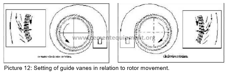 It is recommended that the adjustment be carried out in increments of 5-10°. It must be remembered that increasingly tangential setting of the  guide  vanes causes the pressure drop of the separator to rise and the volume of separating air to fall, which affects the throughput and the efficiency.